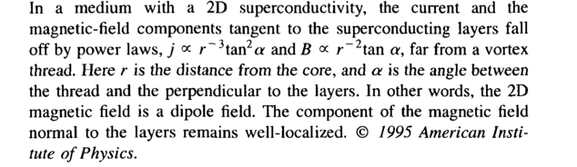 In a medium with a 2D superconductivity, the current and the magnetic-field components tangent to the superconducting layers fall off by power laws, j «■ r~3tan2a and Β « r~2tan a, far from a vortex thread. Here r is the distance from the core, and a is the angle between the thread and the perpendicular to the layers. In other words, the 2D magnetic field is a dipole field. The component of the magnetic field normal to the layers remains well-localized. © 1995 American Institute of Physics.