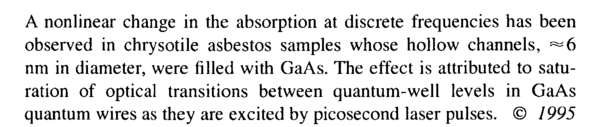 A nonlinear change in the absorption at discrete frequencies has been observed in chrysotile asbestos samples whose hollow channels, ^6 nm in diameter, were filled with GaAs. The effect is attributed to saturation of optical transitions between quantum-well levels in GaAs quantum wires as they are excited by picosecond laser pulses. © 1995