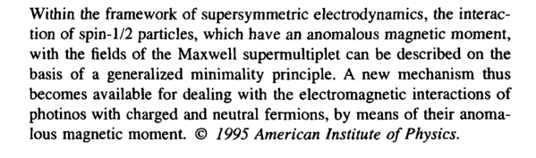 Within the framework of supersymmetric electrodynamics, the interaction of spin-1/2 particles, which have an anomalous magnetic moment, with the fields of the Maxwell supermultiplet can be described on the basis of a generalized minimality principle. A new mechanism thus becomes available for dealing with the electromagnetic interactions of photinos with charged and neutral fermions, by means of their anomalous magnetic moment. © 1995 American Institute of Physics.