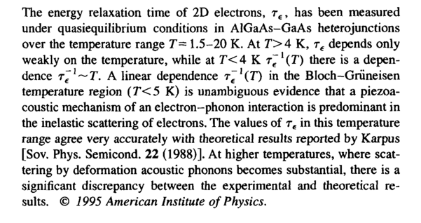 The energy relaxation time of 2D electrons, ÔÅ, has been measured under quasiequilibrium conditions in AlGaAs-GaAs heterojunctions over the temperature range T= 1.5-20 K. At T>4 K, rf depends only weakly on the temperature, while at T<4 ë Ô~\ô) there is a dependence rj' — T. A linear dependence τ~ι(Τ) in the Bloch-Griineisen temperature region (Γ<5 ë) is unambiguous evidence that a piezoa-coustic mechanism of an electron-phonon interaction is predominant in the inelastic scattering of electrons. The values of rf in this temperature range agree very accurately with theoretical results reported by Karpus [Sov. Phys. Semicond. 22 (1988)]. At higher temperatures, where scattering by deformation acoustic phonons becomes substantial, there is a significant discrepancy between the experimental and theoretical results. © 1995 American Institute of Physics.