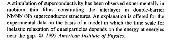 A stimulation of superconductivity has been observed experimentally in niobium thin films constituting the interlayer in double-barrier Nb/Nb'/Nb superconductor structures. An explanation is offered for the experimental data on the basis of a model in which the time scale for inelastic relaxation of quasiparticles depends on the energy at energies near the gap. © 7995 American Institute of Physics.