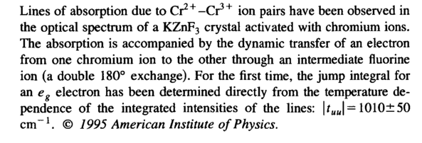 Lines of absorption due to Cr2+-Cr3+ ion pairs have been observed in the optical spectrum of a KZnF3 crystal activated with chromium ions. The absorption is accompanied by the dynamic transfer of an electron from one chromium ion to the other through an intermediate fluorine ion (a double 180° exchange). For the first time, the jump integral for an eg electron has been determined directly from the temperature dependence of the integrated intensities of the lines: |iuJ = 1010±50 cm-1. © 1995 American Institute of Physics.