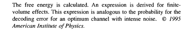 The free energy is calculated. An expression is derived for finite-volume effects. This expression is analogous to the probability for the decoding error for an optimum channel with intense noise. © 1995 American Institute of Physics.