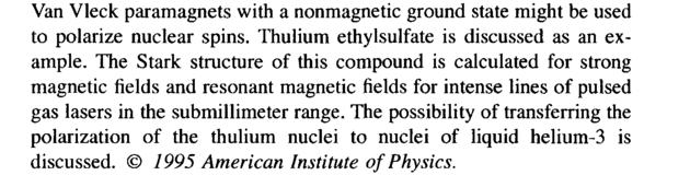 Van Vleck paramagnets with a nonmagnetic ground state might be used to polarize nuclear spins. Thulium ethylsulfate is discussed as an example. The Stark structure of this compound is calculated for strong magnetic fields and resonant magnetic fields for intense lines of pulsed gas lasers in the submillimeter range. The possibility of transferring the polarization of the thulium nuclei to nuclei of liquid helium-3 is discussed. © 1995 American Institute of Physics.