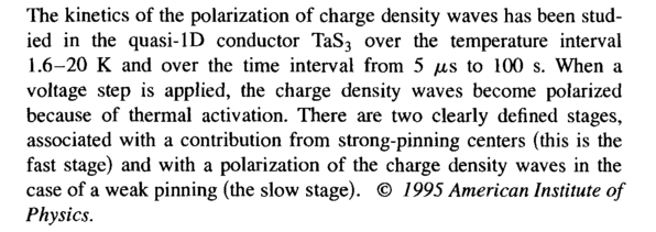 The kinetics of the polarization of charge density waves has been studied in the quasi-ID conductor TaS3 over the temperature interval 1.6-20 К and over the time interval from 5 to 100 s. When a voltage step is applied, the charge density waves become polarized because of thermal activation. There are two clearly defined stages, associated with a contribution from strong-pinning centers (this is the fast stage) and with a polarization of the charge density waves in the case of a weak pinning (the slow stage). © 1995 American Institute of Physics.