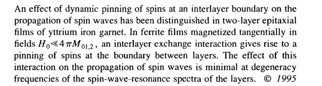 An effect of dynamic pinning of spins at an interlayer boundary on the propagation of spin waves has been distinguished in two-layer epitaxial films of yttrium iron garnet. In ferrite films magnetized tangentially in fields #0<i 47гМ012, an interlayer exchange interaction gives rise to a pinning of spins at the boundary between layers. The effect of this interaction on the propagation of spin waves is minimal at degeneracy frequencies of the spin-wave-resonance spectra of the layers. © 1995