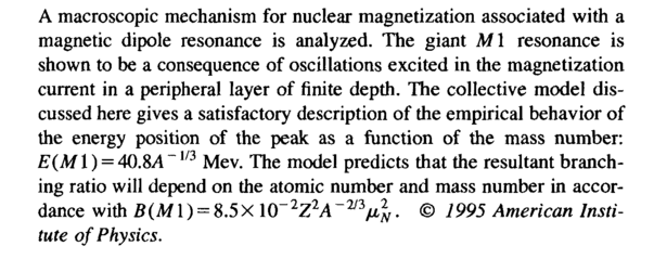 A macroscopic mechanism for nuclear magnetization associated with a magnetic dipole resonance is analyzed. The giant Ml resonance is shown to be a consequence of oscillations excited in the magnetization current in a peripheral layer of finite depth. The collective model discussed here gives a satisfactory description of the empirical behavior of the energy position of the peak as a function of the mass number: E(M 1) = 40.&4 ~1/3 Mev. The model predicts that the resultant branching ratio will depend on the atomic number and mass number in accordance with β(ΛΠ) = 8.5Χ 1(Γ2Ζ2Α-2/3/4· © 1995 American Institute of Physics.