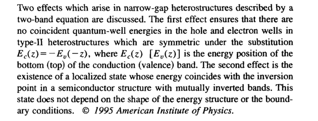 Two effects which arise in narrow-gap heterostructures described by a two-band equation are discussed. The first effect ensures that there are no coincident quantum-well energies in the hole and electron wells in type-II heterostructures which are symmetric under the substitution Ec(z)= -Ev(-z), where Ec(z) [Ev(z)] is the energy position of the bottom (top) of the conduction (valence) band. The second effect is the existence of a localized state whose energy coincides with the inversion point in a semiconductor structure with mutually inverted bands. This state does not depend on the shape of the energy structure or the boundary conditions. © 1995 American Institute of Physics.