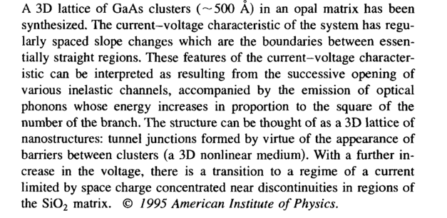 A 3D lattice of GaAs clusters ( — 500 A) in an opal matrix has been synthesized. The current-voltage characteristic of the system has regularly spaced slope changes which are the boundaries between essentially straight regions. These features of the current-voltage characteristic can be interpreted as resulting from the successive opening of various inelastic channels, accompanied by the emission of optical phonons whose energy increases in proportion to the square of the number of the branch. The structure can be thought of as a 3D lattice of nanostructures: tunnel junctions formed by virtue of the appearance of barriers between clusters (a 3D nonlinear medium). With a further increase in the voltage, there is a transition to a regime of a current limited by space charge concentrated near discontinuities in regions of the Si02 matrix. © 7995 American Institute of Physics.