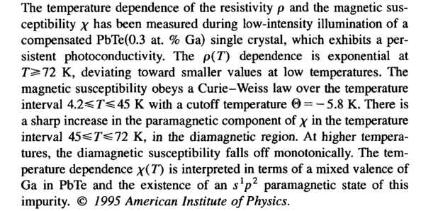 The temperature dependence of the resistivity ρ and the magnetic susceptibility χ has been measured during low-intensity illumination of a compensated PbTe(0.3 at. % Ga) single crystal, which exhibits a persistent photoconductivity. The p(T) dependence is exponential at Γ^72 K, deviating toward smaller values at low temperatures. The magnetic susceptibility obeys a Curie-Weiss law over the temperature interval 4.2«Γ=£45 К with a cutoff temperature Θ = -5.8 К. There is a sharp increase in the paramagnetic component of χ in the temperature interval 45=еГ=£72 K, in the diamagnetic region. At higher temperatures, the diamagnetic susceptibility falls off monotonically. The temperature dependence χ(Τ) is interpreted in terms of a mixed valence of Ga in PbTe and the existence of an s1p2 paramagnetic state of this impurity. © 1995 American Institute of Physics.