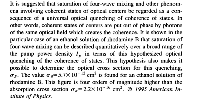 It is suggested that saturation of four-wave mixing and other phenomena involving coherent states of optical centers be regarded as a consequence of a universal optical quenching of coherence of states. In other words, coherent states of centers are put out of phase by photons of the same optical field which creates the coherence. It is shown in the particular case of an ethanol solution of rhodamine В that saturation of four-wave mixing can be described quantitatively over a broad range of the pump power density Ip in terms of this hypothesized optical quenching of the coherence of states. This hypothesis also makes it possible to determine the optical cross section for this quenching, asThe value ae=5JX 10"12 cm2 is found for an ethanol solution of rhodamine B. This figure is four orders of magnitude higher than the absorption cross section σα=2.2Χ 10"16 cm2. © 7995 American Institute of Physics.