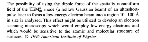 The possibility of using the dipole force of the spatially nonuniform field of the ôåí*! mode (a hollow Gaussian beam) of an ultrashort-pulse laser to focus a low-energy electron beam into a region 10-100 A in size is analyzed. This effect might be utilized to develop an electron scanning microscopy which would employ low-energy electrons and which would be sensitive to the atomic and molecular structure of surfaces. © 1995 American Institute of Physics.