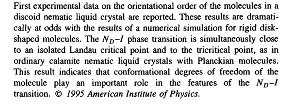 First experimental data on the orientational order of the molecules in a discoid nematic liquid crystal are reported. These results are dramatically at odds with the results of a numerical simulation for rigid disk-shaped molecules. The ND-I phase transition is simultaneously close to an isolated Landau critical point and to the tricritical point, as in ordinary calamite nematic liquid crystals with Planckian molecules. This result indicates that conformational degrees of freedom of the molecule play an important role in the features of the ND-I transition. © 1995 American Institute of Physics.