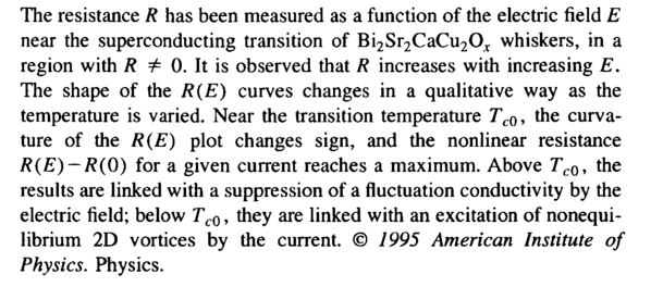 The resistance R has been measured as a function of the electric field Ε near the superconducting transition of Bi2Sr2CaCu20A. whiskers, in a region with R Φ 0. It is observed that R increases with increasing E. The shape of the R(E) curves changes in a qualitative way as the temperature is varied. Near the transition temperature Tc0, the curvature of the R(E) plot changes sign, and the nonlinear resistance R(E) — R(0) for a given current reaches a maximum. Above Tc0, the results are linked with a suppression of a fluctuation conductivity by the electric field; below Tc0, they are linked with an excitation of nonequi-librium 2D vortices by the current. © 7995 American Institute of Physics. Physics.