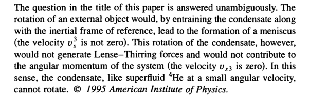 The question in the title of this paper is answered unambiguously. The rotation of an external object would, by entraining the condensate along with the inertial frame of reference, lead to the formation of a meniscus (the velocity v3s is not zero). This rotation of the condensate, however, would not generate Lense-Thirring forces and would not contribute to the angular momentum of the system (the velocity ui3 is zero). In this sense, the condensate, like superfluid 4He at a small angular velocity, cannot rotate. © 1995 American Institute of Physics.