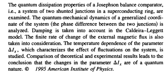 The quantum dissipation properties of a Josephson balance comparator, i.e., a system of two shunted junctions in a superconducting ring, are examined. The quantum-mechanical dynamics of a generalized coordinate of the system (the phase difference between the two junctions) is analyzed. Damping is taken into account in the Caldeira-Leggett model. The finite rate of change of the external magnetic flux is also taken into consideration. The temperature dependence of the parameter Δ/χ, which characterizes the effect of fluctuations on the system, is studied. Comparison of theoretical and experimental results leads to the conclusion that the changes in the parameter ΔΙΧ are of a quantum nature. © 1995 American Institute of Physics.
