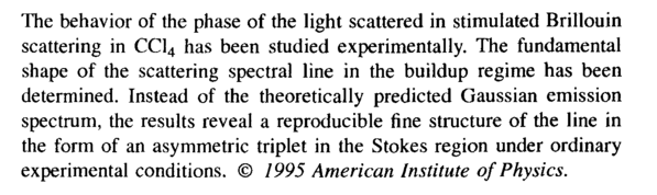 The behavior of the phase of the light scattered in stimulated Brillouin scattering in CC14 has been studied experimentally. The fundamental shape of the scattering spectral line in the buildup regime has been determined. Instead of the theoretically predicted Gaussian emission spectrum, the results reveal a reproducible fine structure of the line in the form of an asymmetric triplet in the Stokes region under ordinary experimental conditions. © 1995 American Institute of Physics.