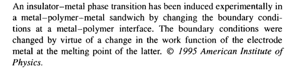 An insulator-metal phase transition has been induced experimentally in a metal-polymer-metal sandwich by changing the boundary conditions at a metal-polymer interface. The boundary conditions were changed by virtue of a change in the work function of the electrode metal at the melting point of the latter. © 1995 American Institute of Physics.