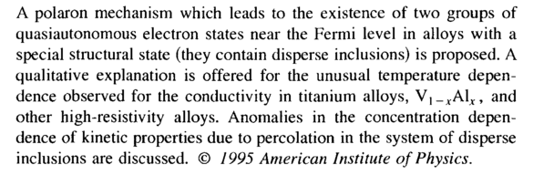 A polaron mechanism which leads to the existence of two groups of quasiautonomous electron states near the Fermi level in alloys with a special structural state (they contain disperse inclusions) is proposed. A qualitative explanation is offered for the unusual temperature dependence observed for the conductivity in titanium alloys, У,_^А1Л, and other high-resistivity alloys. Anomalies in the concentration dependence of kinetic properties due to percolation in the system of disperse inclusions are discussed. © 1995 American Institute of Physics.