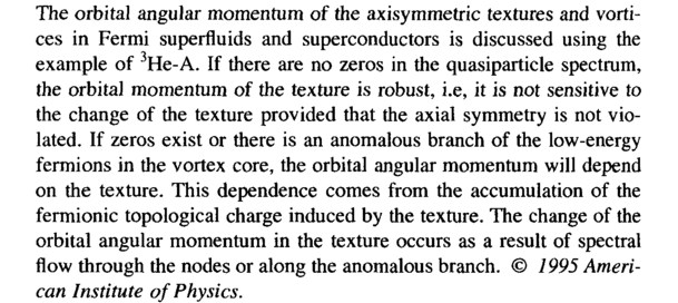 The orbital angular momentum of the axisymmetric textures and vortices in Fermi superfluids and superconductors is discussed using the example of 3He-A. If there are no zeros in the quasiparticle spectrum, the orbital momentum of the texture is robust, i.e, it is not sensitive to the change of the texture provided that the axial symmetry is not violated. If zeros exist or there is an anomalous branch of the low-energy fermions in the vortex core, the orbital angular momentum will depend on the texture. This dependence comes from the accumulation of the fermionic topological charge induced by the texture. The change of the orbital angular momentum in the texture occurs as a result of spectral flow through the nodes or along the anomalous branch. © 7995 American Institute of Physics.