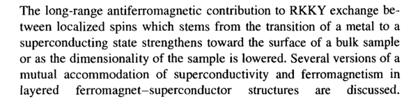 The long-range antiferromagnetic contribution to RKKY exchange between localized spins which stems from the transition of a metal to a superconducting state strengthens toward the surface of a bulk sample or as the dimensionality of the sample is lowered. Several versions of a mutual accommodation of superconductivity and ferromagnetism in layered ferromagnet-superconductor structures are discussed.
