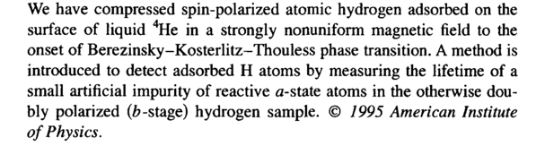 We have compressed spin-polarized atomic hydrogen adsorbed on the surface of liquid 4He in a strongly nonuniform magnetic field to the onset of Berezinsky-Kosterlitz-Thouless phase transition. A method is introduced to detect adsorbed Η atoms by measuring the lifetime of a small artificial impurity of reactive α-state atoms in the otherwise doubly polarized (&-stage) hydrogen sample. © 1995 American Institute of Physics.