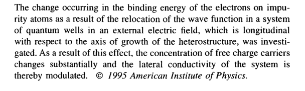 The change occurring in the binding energy of the electrons on impurity atoms as a result of the relocation of the wave function in a system of quantum wells in an external electric field, which is longitudinal with respect to the axis of growth of the heterostructure, was investigated. As a result of this effect, the concentration of free charge carriers changes substantially and the lateral conductivity of the system is thereby modulated. © 1995 American Institute of Physics.