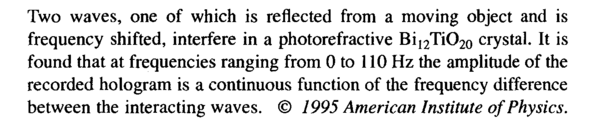 Two waves, one of which is reflected from a moving object and is frequency shifted, interfere in a photorefractive BiI2Ti02o crystal. It is found that at frequencies ranging from 0 to 110 Hz the amplitude of the recorded hologram is a continuous function of the frequency difference between the interacting waves. © 1995 American Institute of Physics.