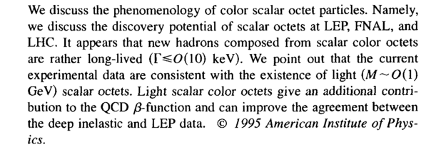 We discuss the phenomenology of color scalar octet particles. Namely, we discuss the discovery potential of scalar octets at LEP, FNAL, and LHC. It appears that new hadrons composed from scalar color octets are rather long-lived (Γ=£0(1Ο) keV). We point out that the current experimental data are consistent with the existence of light (M~(?(l) GeV) scalar octets. Light scalar color octets give an additional contribution to the QCD ^function and can improve the agreement between the deep inelastic and LEP data. © 1995 American Institute of Physics.