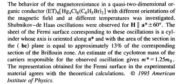 The behavior of the magnetoresistance in a quasi-two-dimensional organic conductor (ET)8[Hg4Cl8(C6H5Br)2] with different orientations of the magnetic field and at different temperatures was investigated. Shubnikov-de Haas oscillations were observed for Η || a* ±60°. The sheet of the Fermi surface corresponding to these oscillations is a cylinder whose axis is oriented along a* and with the area of the section in the ( be) plane is equal to approximately 13% of the corresponding section of the Brillouin zone. An estimate of the cyclotron mass of the carriers responsible for the observed oscillation gives m*=\.25m0. The representation obtained for the Fermi surface in the experimental material agrees with the theoretical calculations. © 1995 American Institute of Physics.