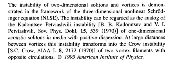 The instability of two-dimensional solitons and vortices is demonstrated in the framework of the three-dimensional nonlinear Schrod-inger equation (NLSE). The instability can be regarded as the analog of the Kadomtsev-Petviashvili instability [В. B. Kadomtsev and V. I. Petviashvili, Sov. Phys. Dokl. 15, 539 (1970)] of one-dimensional acoustic solitons in media with positive dispersion. At large distances between vortices this instability transforms into the Crow instability [S.C. Crow, AIAA J. 8, 2172 (1970)] of two vortex filaments with opposite circulations. © 7995 American Institute of Physics.