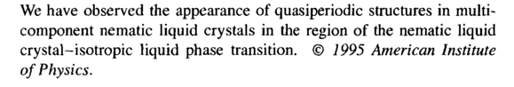 We have observed the appearance of quasiperiodic structures in multi-component nematic liquid crystals in the region of the nematic liquid crystal-isotropic liquid phase transition. © 1995 American Institute of Physics.