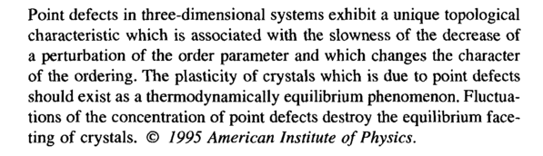 Point defects in three-dimensional systems exhibit a unique topological characteristic which is associated with the slowness of the decrease of a perturbation of the order parameter and which changes the character of the ordering. The plasticity of crystals which is due to point defects should exist as a thermodynamically equilibrium phenomenon. Fluctuations of the concentration of point defects destroy the equilibrium faceting of crystals. © 7995 American Institute of Physics.