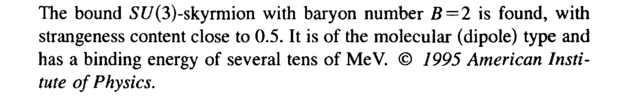 The bound St/(3)-skyrmion with baryon number β = 2 is found, with strangeness content close to 0.5. It is of the molecular (dipole) type and has a binding energy of several tens of MeV. © 7995 American Institute of Physics.