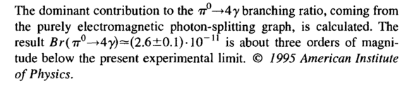 The dominant contribution to the π —>4γ branching ratio, coming from the purely electromagnetic photon-splitting graph, is calculated. The result fir(7r°—>4-y)~(2.6±0.1)· 10~u is about three orders of magnitude below the present experimental limit. © 1995 American Institute of Physics.