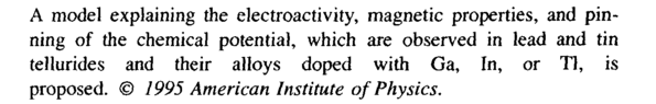 A model explaining the electroactivity, magnetic properties, and pinning of the chemical potential, which are observed in lead and tin tellurides and their alloys doped with Ga, In, or Tl, is proposed. © 1995 American Institute of Physics.