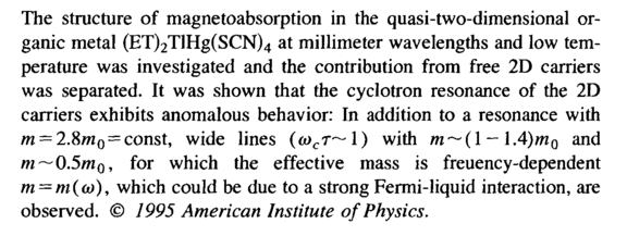 The structure of magnetoabsorption in the quasi-two-dimensional organic metal (ET)2TlHg(SCN)4 at millimeter wavelengths and low temperature was investigated and the contribution from free 2D carriers was separated. It was shown that the cyclotron resonance of the 2D carriers exhibits anomalous behavior: In addition to a resonance with m = 2.8w0 = const, wide lines (<wcr~l) with m~(\ — l.4)m0 and m~0.5m0, for which the effective mass is freuency-dependent ιη = ηι(ω), which could be due to a strong Fermi-liquid interaction, are observed. © 1995 American Institute of Physics.