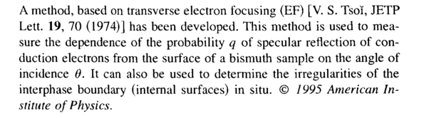 A method, based on transverse electron focusing (EF) [V. S. Tsoi, JETP Lett. 19, 70 (1974)] has been developed. This method is used to measure the dependence of the probability q of specular reflection of conduction electrons from the surface of a bismuth sample on the angle of incidence Θ. It can also be used to determine the irregularities of the interphase boundary (internal surfaces) in situ. © 1995 American Institute of Physics.