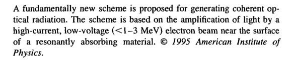 A fundamentally new scheme is proposed for generating coherent optical radiation. The scheme is based on the amplification of light by a high-current, low-voltage (<l-3 MeV) electron beam near the surface of a resonantly absorbing material. © 1995 American Institute of Physics.
