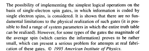 The possibility of implementing the simplest logical operations on the basis of single-electron spin gates, in which information is coded by single electron spins, is considered. It is shown that there are no fundamental limitations to the physical realization of such gates (it is possible to find a range of system parameters in which the entire truth table can be realized). However, for some types of the gates the magnitude of the average spin (which carries the information) proves to be rather small, which can present a serious problem for attempts at real fabrication of these gates. © 1995 American Institute of Physics.