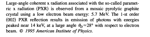 Large-angle coherent χ radiation associated with the so-called parametric χ radiation (PXR) is observed from a mosaic pyrolytic graphite crystal using a low electron beam energy: 5.7 MeV. The 1-st order (002) PXR reflection results in emission of photons with energies peaked near 14 keV, at a large angle 6>D=28° with respect to electron beam. © 1995 American Institute of Physics.