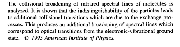 The collisional broadening of infrared spectral lines of molecules is analyzed. It is shown that the indistinguishability of the particles leads to additional collisional transitions which are due to the exchange processes. This produces an additional broadening of spectral lines which correspond to optical transitions from the electronic-vibrational ground state. © 1995 American Institute of Physics.