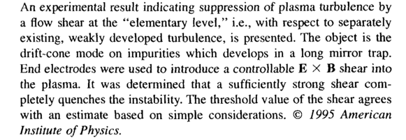 An experimental result indicating suppression of plasma turbulence by a flow shear at the "elementary level," i.e., with respect to separately existing, weakly developed turbulence, is presented. The object is the drift-cone mode on impurities which develops in a long mirror trap. End electrodes were used to introduce a controllable Ε Χ В shear into the plasma. It was determined that a sufficiently strong shear completely quenches the instability. The threshold value of the shear agrees with an estimate based on simple considerations. © 1995 American Institute of Physics.