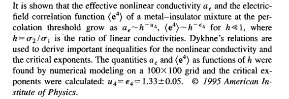 It is shown that the effective nonlinear conductivity ae and the electric-field correlation function (e4) of a metal-insulator mixture at the percolation threshold grow as ae~h~"*, (e4)~h~e* for h<\, where Η — σ2Ι<Τ\ is the ratio of linear conductivities. Dykhne's relations are used to derive important inequalities for the nonlinear conductivity and the critical exponents. The quantities ae and {e4) as functions of h were found by numerical modeling on a 100X 100 grid and the critical exponents were calculated: и4= e4= 1.33±0.05. © 1995 American Institute of Physics.