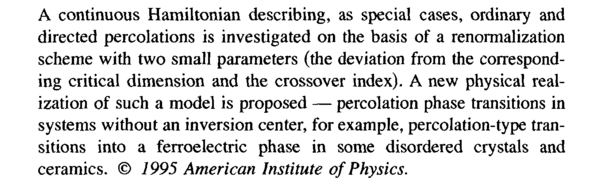 A continuous Hamiltonian describing, as special cases, ordinary and directed percolations is investigated on the basis of a renormalization scheme with two small parameters (the deviation from the corresponding critical dimension and the crossover index). A new physical realization of such a model is proposed — percolation phase transitions in systems without an inversion center, for example, percolation-type transitions into a ferroelectric phase in some disordered crystals and ceramics. © 1995 American Institute of Physics.