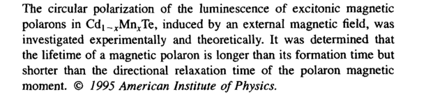 The circular polarization of the luminescence of excitonic magnetic polarons in Cd^Mn/Ге, induced by an external magnetic field, was investigated experimentally and theoretically. It was determined that the lifetime of a magnetic polaron is longer than its formation time but shorter than the directional relaxation time of the polaron magnetic moment. © 1995 American Institute of Physics.