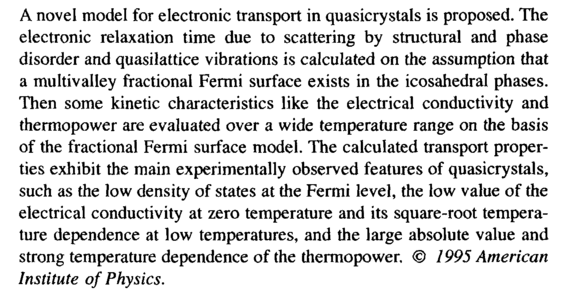 A novel model for electronic transport in quasicrystals is proposed. The electronic relaxation time due to scattering by structural and phase disorder and quasilattice vibrations is calculated on the assumption that a multivalley fractional Fermi surface exists in the icosahedral phases. Then some kinetic characteristics like the electrical conductivity and thermopower are evaluated over a wide temperature range on the basis of the fractional Fermi surface model. The calculated transport properties exhibit the main experimentally observed features of quasicrystals, such as the low density of states at the Fermi level, the low value of the electrical conductivity at zero temperature and its square-root temperature dependence at low temperatures, and the large absolute value and strong temperature dependence of the thermopower, © 1995 American Institute of Physics.