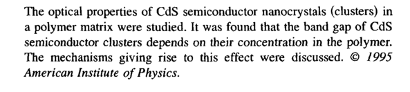 The optical properties of CdS semiconductor nanocrystals (clusters) in a polymer matrix were studied. It was found that the band gap of CdS semiconductor clusters depends on their concentration in the polymer. The mechanisms giving rise to this effect were discussed. © 1995 American Institute of Physics.