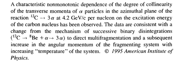 A characteristic nonmonotonic dependence of the degree of collinearity of the transverse momenta of a particles in the azimuthal plane of the reaction 12C —> 3 a at 4.2 GeV/c per nucleon on the excitation energy of the carbon nucleus has been observed. The data are consistent with a change from the mechanism of successive binary disintegrations (12C —> 8Be + a—> За) to direct multifragmentation and a subsequent increase in the angular momentum of the fragmenting system with increasing "temperature" of the system. © 1995 American Institute of Physics.