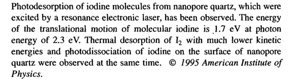 Photodesorption of iodine molecules from nanopore quartz, which were excited by a resonance electronic laser, has been observed. The energy of the translational motion of molecular iodine is 1.7 eV at photon energy of 2.3 eV. Thermal desorption of I2 with much lower kinetic energies and photodissociation of iodine on the surface of nanopore quartz were observed at the same time. © 7995 American Institute of Physics.